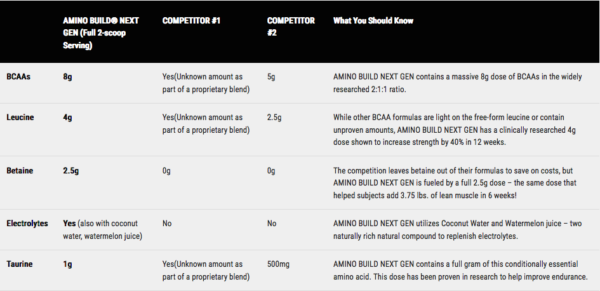 C’est un complexe d’acides aminés de très haute qualité car il contient 4g de BCAA sous forme libre. Les BCAA sont des acides aminés indispensables au métabolisme musculaire qui permettent la synthèse des protéines, favorisent la croissance musculaire ainsi que votre récupération. Ils limitent également le catabolisme ainsi que la fatigue pour un maximum d’énergie. Amino Build Next Gen est donc une formule puissante de BCAA.